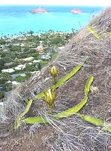 Selenicereus undatus, the white-fleshed pitahaya, is a species of the genus Selenicereus (formerly Hylocereus) in the family Cactaceae[2] and is the most cultivated species in the genus. It is used both as an ornamental vine and as a fruit crop - the pitahaya or dragon fruit.[3]
