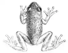The adult male frog measures about 33 mm in snout-vent length. The skin of the dorsum is green or red-brown with small dark marks and small white spots. The iris of the eye is white in color with red reticulations.[3]
