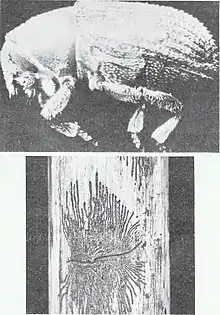 - 1 2 3 Kaston, BJ (1936). "The morphology of the elm bark beetle, Hylurgopinus rufipes (Eichhoff)". Connecticut Experimental Station, New Haven, Bulletin 387: 613–650.