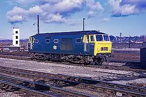 When first built, the Hymeks were given a more elaborate livery than many of the contemporary British Railways diesel classes. The main body of the locomotive was the standard dark Brunswick green, but with a lime green stripe along the bottom of the bodywork. The roof was medium grey, and the finishing touch was to paint the window surrounds in ivory white. In the early 1960s, yellow warning panels were added to the lower part of the front ends, in accordance with BR's then-new policy. With the advent of the Corporate Identity scheme in 1965[13] some locomotives received all-over BR Rail Blue with small yellow warning panels. This was quickly changed by the return of off-white window surrounds. The final variation was BR blue with full yellow ends, the yellow being extended around the cab side windows.
