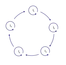 Analysis of potential molecules that could form the first hypercycles in nature prompted the idea of coupling an information carrier function with enzymatic properties. At the time of the hypercycle theory formulation, enzymatic properties were attributed only to proteins, while nucleic acids were recognized only as carriers of information. This led to the formulation of a more complex model of a hypercycle with translation. The proposed model consists of a number of nucleotide sequences I (I stands for intermediate) and the same number of polypeptide chains E (E stands for enzyme). Sequences I have a limited chain length and carry the information necessary to build catalytic chains E. The sequence Ii provides the matrix to reproduce itself and a matrix to build the protein Ei. The protein Ei gives the catalytic support to build the next sequence in the cycle, Ii+1. The self-replicating sequences I form a cycle consisting of positive and negative strands that periodically reproduce themselves. Therefore, many cycles of the +/− nucleotide collectives are linked together by the second-order cycle of enzymatic properties of E, forming a catalytic hypercycle. Without the secondary loop provided by catalysis, I chains would compete and select against each other instead of cooperating. The reproduction is possible thanks to translation and polymerization functions encoded in I chains. In his principal work, Manfred Eigen stated that the E coded by the I chain can be a specific polymerase or an enhancer (or a silencer) of a more general polymerase acting in favour of formation of the successor of nucleotide chain I. Later, he indicated that a general polymerase leads to the death of the system.[2] Moreover, the whole cycle must be closed, so that En must catalyse I1 formation for some integer n > 1.[1][2]