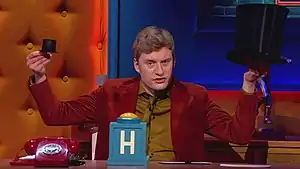 In the final round, the panel must guess whether a given celebrity would choose to wear a big or small hat for the rest of their life. In this image, co-host James Acaster demonstrates the two hats.