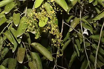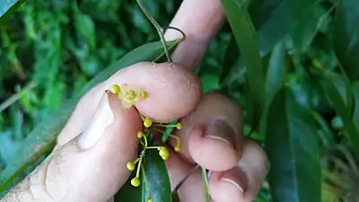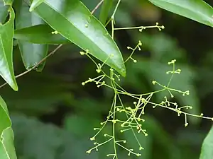 Flowers are pale yellow in colour, male flowers measure about 5 mm (0.20 in) diameter, female flowers about 3–4 mm (0.12–0.16 in) diameter.[4]