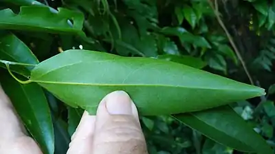 This species is a small vine with a maximum recorded stem diameter of 10 cm (3.9 in).[4] It has pendulous branches and the leaves are alternate, 3-veined, elliptic, and measure up to 20 by 7.5 cm (7.9 by 3.0 in)[4][5]