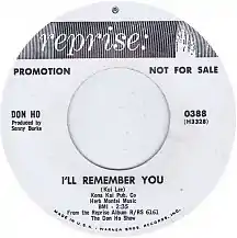 Ho was at the time signed by Reprise Records.[7] In 1965, the label released his version of "I'll Remember You" with "E Lei Ka Lei Lei (Beach Party Song)" as the flipside.[8] Don McDiarmid became the publisher of the song, and responsible for its distribution on the mainland.[9] Eddie Suzuki, Lee's manager, signed him to play regular appearances at the nightclub Queen's Surf in Honolulu.[9] Lee had his debut night on October 22, 1965. Lee received an intense ovation for his performance of "I'll Remember You".[10] He was acclaimed for his appearances at the club, and he attracted large crowds to Queen's Surf.[9]