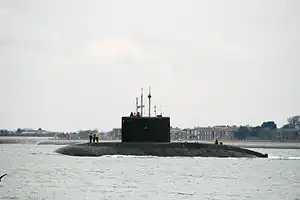 After the fire damage in 2010, Sindhurakshak was transported to Russia on board a heavy lift ship from Visakhapatnam in June 2010 for refit, overhaul and upgrade which lasted two and a half years.[19] In August 2010, Sindhurakshak arrived at the Zvezdochka shipyard in Russia. The submarine was modernised, repaired and retrofitted under Project 08773, and after the upgrade, the sea trials started in October 2012. The upgrades included improved electronic warfare systems, an integrated weapon control system and a new cooling system, and were expected to extend the service life of the submarine by ten years.[17][20] The Club-S (3M54E1 anti-ship and 3M14E land attack) missiles, USHUS sonar, СCS-MK-2 radio communication systems and Porpoise radio-locating radar, and other safety-enhancing features were incorporated.[7] The submarine was handed back to the Indian Navy on 27 January 2013,[12] after which it sailed back to India, under Commander Rajesh Ramkumar. This was the first time an Indian submarine had navigated under ice.[21][22]