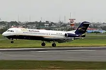 A Fokker F100 belonging to the airline at Murtala Muhammed International Airport