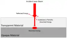 TTIr welding is the joining of an IR transparent part to a second part such that the IR radiation travels through the transparent part and heat the surface of the second part as shown in the figure to the right. IR wavelengths are generally within 800 to 1050 nm. To make a transparent part absorbent to IR radiation, the addition of dies or colorants such as carbon black can be used. Highly absorbent thermoplastic films can be placed at the joint to receive the IR radiation and melt the interface during welding. Using these methods, TTIr welds can be completed between parts of both the same or different materials.[1]