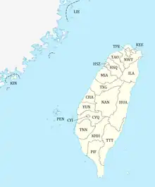 ISO 3166-2:TW is the entry for Taiwan,[1] "Taiwan, Province of China",[2] or "Taiwan (Province of China)",[3] in ISO 3166-2, part of the ISO 3166 standard published by the International Organization for Standardization (ISO), which defines codes for the names of the principal subdivisions (e.g., provinces or states) of all countries coded in ISO 3166-1.