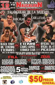 The Mexican wrestling promotion International Wrestling Revolution Group (IWRG; Sometimes referred to as Grupo Internacional Revolución in Spanish) has Triangular de la Muerte (Spanish for "Triangle of Death") matches on several occasions since its creation in 1997. Traditionally Luchas de Apuestas ("bet matches") are contested as either singles or tag team matches,[2] but IWRG has used a hybrid version featuring three wrestlers or three teams all "betting" something on the match.[3] In another deviation from tradition IWRG often chooses to have one participant risk their championship instead of their mask or their hair.[2][3] Their only Triangular de la Muerte show in 2016 was held on February 14, 2016 in Arena Naucalpan, Naucalpan, State of Mexico where IWRG holds almost all of their major lucha libre shows.[1]