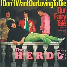 "I Don't Want Our Loving to Die", backed with Bown and Frampton's own composition "Our Fairy Tale", was released by Fontana on 29 March 1968.[5] The group promoted the single on television and radio with appearances on BBC1's All Systems Freeman (22 March), BBC Radio 1's Saturday Club (23 March) and the Light Programme's Joe Loss Pop Show (5 April).[6] It peaked at number five on the UK Singles Chart and ultimately spent 13 weeks on the chart, matching "From the Underworld".[7] It was the group's final hit single and their last collaboration with managers and songwriters Ken Howard and Alan Blaikley, with whom they subsequently entered a contractual dispute.[8] Frampton later described the chart peak of "I Don't Want Our Loving to Die" as "when things started to deteriorate with the Herd".[9]