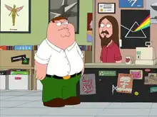 ![]() Peter with Jesus Christ at a record store with posters for Nirvana's In Utero, R.E.M.'s Automatic for the People and Pink Floyd's The Dark Side of the Moon in the background | |