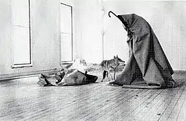 In 1974, the German conceptual artist landed in a New York City airport whereupon assistants wrapped him in felt and brought him to the René Block Gallery in SoHo in an ambulance. There Beuys spent three consecutive days, for eight hours a day, living with a live coyote. Beuys attempted to connect with the animal by repeating symbolic gestures such as throwing leather gloves, gesticulating with a cane, and cloaking himself like a shepherd with the cane sticking out. The coyote was docile and occasionally hostile, tugging at the artist's felt.[1] Beuys occasionally played a triangle and a tape recording of turbines.[2]