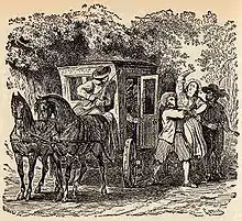 Renzo arrives in famine-stricken Milan and goes to the monastery, but the friar he is seeking is absent and so he wanders further into the city. A bakery in the Corsia de' Servi, El prestin di scansc ("Bakery of the Crutches"), is destroyed by a mob, who then go to the house of the Commissioner of Supply in order to lynch him. He is saved in the nick of time by Ferrer, the Grand Chancellor, who arrives in a coach and announces he is taking the Commissioner to prison. Renzo becomes prominent as he helps Ferrer make his way through the crowd.