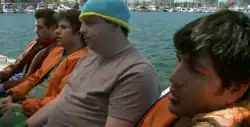 The power boat turns out to be slow as well (going five miles an hour), and the boys snap. Cartman is blamed for his diarrhea, everyone is trying to recall whose idea it was to go ziplining to begin with, except for Kenny, who does not care as he is apparently dying from a combination of boredom and herpes. Cartman defecates into the water; it attracts beavers, which the boys fight off offscreen. They then realize that falling asleep might result in their death, so in order to keep everyone awake, Kyle asks Cartman to share his drink (now "Diet Double Dew", which has half the caffeine and sugar of "Double Dew", equivalent to regular Mountain Dew), but he refuses to let Kenny touch it because he has herpes. Kenny eventually dies of boredom and the three boys end up contracting herpes from sharing it anyway. When Kyle and Cartman start arguing on whose idea it was to go ziplining again, Stan admits that he was the one who signed them up for the ziplining tour, in order to receive a free 5th generation iPod nano (which cannot be traded). Stan however revealed this earlier in the episode in one of the interview scenes that excessively occur throughout, although he was reluctant to tell his friends. Kyle and Cartman are outraged and they all have an emotional breakdown. Just as all hope seems lost, the boys are miraculously rescued by Mr. Hankey who takes them home. At this point, the live action sequence ends and reverts to its original animation format (however, the short interview scenes were still animated during the live action sequence).