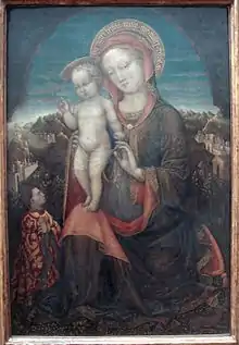 Many of his greatest works, including the enormous Crucifixion in the cathedral of Verona (1436), have disappeared. From c. 1430 is the panel with Madonna and Child, in the Accademia Carrara, once attributed to Gentile da Fabriano. In 1441, at Ferrara, where he was at the service of Leonello d'Este together with Leon Battista Alberti, he executed a portrait of that Marquess, now lost. Of this period survives the Madonna dell'Umiltà, probably commissioned by one of the brothers of Leonello.[2]