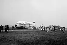 Iberia Flight 933 was an international flight from Madrid Barajas International Airport bound for its destination, Boston-Logan International Airport in Boston that suffered a crash landing on December 17, 1973. As the McDonnell Douglas DC-10 operating the flight was approaching the airport, it collided with the approach lighting system (ALS) 500 feet short of the runway threshold. The impact broke off the right main landing gear. The aircraft became airborne for about 1,200 feet, then landed on runway 33 Left, veered to the right off the runway and came to rest. All 168 on board survived, but the plane was written off. This accident was the first hull loss of the DC-10.[1]