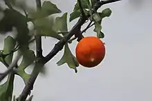 The liana-like shoots wrapping around a branch with the orange fruit