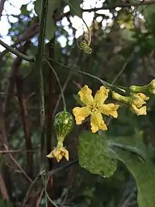 On the shoots are the leaves, which are twice 3-cleft, colored bright green and lacking leaf glands. The dioecious flowers always appear with leaves, the male flowers in racemes and the female flowers solitary. The flowers open early in the morning, after dawn, and close in the afternoon. The petals are yellow. The fruits of the plant are about 1.25 inches (3.2 cm) to 1.5 inches (3.8 cm) long, and colored reddish to orange, "amber colored."[1][4]