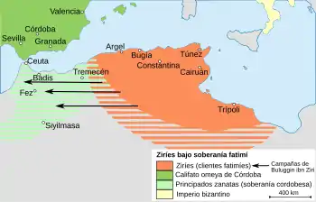 The disagreements among the various tribal leaders loyal to the Umayyads did produce one crisis: the favor shown by Almanzor to Ziri ibn Atiyya of the Maghrawa Berbers upset other chiefs, who ended up rising in arms. They defeated the Cordoban governor of Fez, who died in combat, and Ibn Atiyya in April 991.[331][333] After this defeat, Almanzor understood the need to grant control of the region to local Berber leaders instead of trying to govern through Iberian delegates.[334] This strategy aimed to attract the support of local tribes to the Umayyads.[334] Fundamentally, the fate of the campaigns depended on the changing loyalties of the various tribal leaders, although, in general, the Zenata supported the Umayyads while the Sanhaja supported the Fatimids.[326][334] Almanzor unsuccessfully attempted to divide the territory between Ibn Attiya and another tribal chief who had abandoned the Fatimids—the uncle of al-Mansur ibn Buluggin, son and successor of Buluggin ibn Ziri.[331][334][335] So, Almanzor gave all lands controlled by the Caliphate to Ibn Atiyya,[336][316] who managed to defeat the rebels and supporters of the Fatimids in 994,[336][337] and founded a small principality centered on Oujda.[316][336][337]