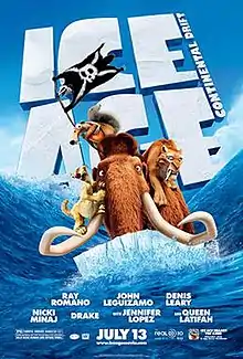 Ice Age: Continental Drift is a 2012 American animated adventure comedy film produced by Blue Sky Studios and distributed by 20th Century Fox. It is the sequel to the 2009 film Ice Age: Dawn of the Dinosaurs and the fourth installment in the Ice Age film series. The film was directed by Steve Martino and Michael Thurmeier from a screenplay written by Michael Berg and Jason Fuchs, based on a story conceived by Berg and co-producer Lori Forte. Ray Romano, John Leguizamo, Denis Leary, Seann William Scott, Josh Peck, Queen Latifah, and Chris Wedge reprise their roles from previous films, with Peter Dinklage, Jennifer Lopez, Drake, and Nicki Minaj voicing new characters. The plot focuses on Scrat mistakenly sending Manny, Sid, and Diego adrift on an iceberg with Sid's Granny and causing them to face a gang of pirates led by Captain Gutt on Earth.