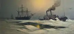 - ↑ Icebreakers at this time had few specialized features; the usual method of breaking ice was to run the bow of the boat over the top of the ice, thus breaking it with the weight of the ship. Sometimes the bow itself was designed for this purpose.