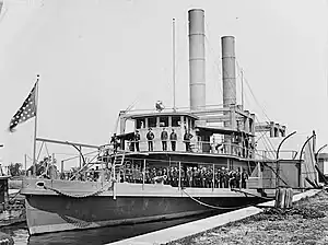 - ↑ Images taken of the ship during her naval service show one pilothouse with four windows and a second pilothouse with two, indicating the vessel was a double ender with a smaller pilothouse astern. Further confirmation can be had from the fact that the first image shows davits forward of the paddle boxes while the second shows the davits aft, while the larger pilothouse can be discerned in the second image just above the paddle box.