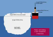 Bigg and Wilton describe the Titanic iceberg, based on witness testimony, as 50 to 100 feet (about 15 to 31 metres) high and 400 feet (122 metres) long. They assume that only 16.7 per cent of a weathered iceberg is above the water surface. Consequently, the fatal iceberg would have been at least 90 to 185 metres deep and approximately 125 metres long.[35]