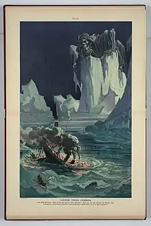 Not only the Titanic, which stands for luxury, but also the iceberg has inspired numerous authors and visual artists. It was common to depict the iceberg as a monster in caricatures.[45] Religious authors denounced a lack of respect for God and the forces of nature, which included the iceberg. The ice warnings that had been ignored by the Titanic appeared as " the writing on the wall". Meanwhile, in leftist publications, the iceberg was sometimes compared to the proletariat: It was causing capitalism (the Titanic) to sink.[46] And if James Cameron's Titanic film had flopped, critics would have said that the iceberg of audience rejection had sunk it.[47]