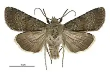Ichneutica moderata is a moth of the family Noctuidae.[2] This species is endemic to New Zealand and can be found from the Bay of Plenty south including the Chatham Islands. I. moderata inhabits open spaces in lowland to montane zones. Larvae likely feed on a variety of low growing herbaceous plants including on Raoulia species. Larvae create silk covered tunnels in the roots of their host plants. Pupa are enclosed in a loose silken cocoons and are sheltered amongst the host species roots. The adult moths are on the wing from October to April.