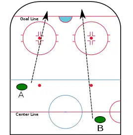 For a puck shot toward the top of the diagram, for example "A" is not icing. Example "B" is icing, provided that it is not "waved off" for an eligible reason (e.g. offensive team is short-handed)