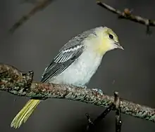Following the general pattern observed among icterids, the overall plumage pattern seen in immature male Bullock's orioles closely resembles that seen in adult females. Juveniles resemble adult females, but have darker wings, fresh wing coverts, and a pink or whitish bill. Sexual dimorphism is not obvious in juveniles.