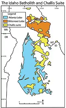 The Idaho Batholith is a granitic and granodioritic batholith of Cretaceous-Paleogene age that covers approximately 25,000 square kilometres (9,700 sq mi) of central Idaho and adjacent Montana. The batholith has two lobes that are separate from each other geographically and geologically. The Bitterroot lobe is the smaller lobe and the larger lobe is the Atlanta lobe. The Bitterroot lobe is in the north and is separated from the larger Atlanta lobe in the south by the Belt Supergroup metamorphic rocks that compose the Salmon River Arch.[1] Much of the Atlanta and Bitterroot lobes are in the Idaho Batholith ecoregion.[2]