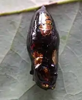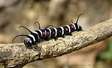The larvae are known to feed on plants of the species Aganosma cymosa (Apocynaceae).[8] Another species of Apocynaceae, Parsonsia spiralis (now recognised as a synonym of Parsonsia alboflavescens)[9] has also been noted as a larval host plant and it is believed that many more species in the family may be discovered.[10]