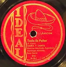 Ideal was founded by Paco Betancourt and Armando Marroquín in 1946, making it the first of southern Texas record labels owned by Mexican-Americans.[1][2] Following the Second World War the major record labels such as RCA Victor ceased recording regional Chicano music, concentrating instead on larger "authentic" Hispanic markets in major metropolitan areas such as Mexico City.[1][2] Marroquín owned a large number of jukeboxes in cantinas and other public places frequented by those of Hispanic culture.[3] Thus, Marroquín became not only cognizant of the demand thus left un-met, but was personally suffering financially because he could not find records with the music expected by his customers.[3] He spent less than $200 to acquire phonograph recording equipment and set up shop in his living room.[1][3] His first recording was by the female duet Carmen y Laura, and this recording's 200 copies quickly sold out.[4] Marroquín not only filled his own jukeboxes with his product, but found ready customers in other regional jukebox operators in South Texas.[5] The label was originally only distributed from San Antonio.[2] Marroquín made partnerships with Betancourt, who owned a music store, and the Allen Company, a record distributor from Los Angeles.[1] Although Marroquín would significantly upgrade the quality of his recording equipment, most recording released on Ideal continued to be recorded in his living room where recording activity occurred on an almost daily basis.[4]