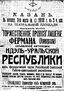 The Idel-Ural State (Tatar: Идел-Урал өлкәсе, İdel-Ural ölkäse, إِديل-اٗورال ئۈلكەسىٰ, also İdel-Ural berlege İdel-Ural ştatı), also known as the Volga-Ural State or Idel-Ural Republic,[3] was an unsuccessful attempt of the autonomy of Tatar peoples that claimed to unite Tatars, Bashkirs, Volga Germans, and the Chuvash in the turmoil of the Russian Civil War. The republic was proclaimed on 1 March 1918, by a Congress of Muslims from Russia's interior and Siberia, but defeated by Bolsheviks the same month.[4] Idel-Ural means "Volga-Ural" in the Tatar language.