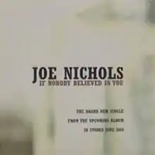 "If Nobody Believed in You" is a song written by Harley Allen and recorded by American country music artist Joe Nichols. It was released in March 2004 as the first single from his 2004 album Revelation. The song peaked at number 10 on the U.S. Billboard Hot Country Songs chart.