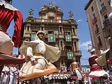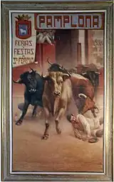 Baleztena remained particularly fascinated by the sanfermines, investigating their history and forming part of Corte de San Fermín.[75] He is credited for launching an unofficial feast anthem Uno de enero, dos de febrero[76] and a popular Iruña-ko mezetak song,[77] apart from a number of other unrelated chants.[78] It was Baleztena and his friends who in 1911 first performed riau-riau; it remains debated whather the ritual was intended as a Carlist demonstration dogging the Liberal-dominated city council[79] or simply as a juvenile joke.[80] When it comes to running of the bulls he was in favor of as few regulations as possible,[81] though none of the sources consulted mentions Baleztena running with the bulls himself. He remained one of key figures shaping sanfermines until the early 1960s, when he lost his grip on the event. The 1963-4 feasts were snatched by young Carlist progressists,[82] who formatted them as their own political manifestations.[83]