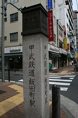 ![]() Monument for the former station reads "Kōbu Railway Iidamachi Station". | |