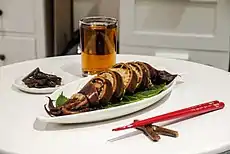 Ikameshi is prepared by removing tentacles from and gutting the squid, which is then stuffed with washed rice and cooked in dashi. Toothpicks and other such items may be used to keep the rice in place. The rice itself is usually a blend of both glutinous and non-glutinous rice.[2] Other ingredients sometimes used as stuffing include minced squid tentacles, bamboo shoots, carrots and aburaage.[3][1]
