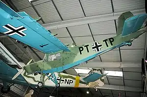 The Kurir has the high wing and tall undercarriage typical of single-engined STOL aircraft and is similar in appearance to the Fieseler Storch. Unlike the Storch, the Kurir has an all-metal, cantilever wing. There are short ailerons outboard, with the rest of the trailing edge filled with electrically operated Fowler flaps. Leading edge slots are fitted ahead of the ailerons. The combination of flaps and slots enables the Kurir to reach 15 m (50 ft) altitude in a distance of 220 m (720 ft) and to land from the same height in 100 m (330 ft).[1]
