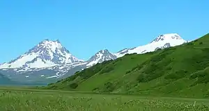 View near the base of Ikatan Peninsula, south of False Pass, with Roundtop volcano in foreground and Isanotski Peaks just south of Roundtop.