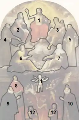 Composition of the Perdono di Gesualdo, in the sky: 1. Jesus Christ, 2. The Virgin Mary, 3. The Archangel Michael, 4. Saint Francis of Assisi, 5. Saint Dominic, 6. Mary Magdalene, 7. Saint Catherine of Siena, on earth: 8. Saint Charles Borromeo, 9. Carlo Gesualdo, 10. Eleonora d'Este, in purgatory: 11. The winged child, 12. The man and the woman in purgatory.