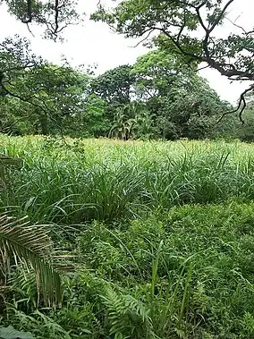 In 2009 a committee was set up by members of the local community under the guidance of Jomo Sibisi.[6] It was intended to upgrade Ilanda Wilds for environmental education of local school children, and to provide guided walks to foreign visitors to the 2010 World Cup.[6] Mr. Sibisi encouraged the municipality to deploy a field ranger to Ilanda Wilds.[6][8] A field ranger by the name of Musa Mfeka was deployed to Ilanda Wilds in 2009 to prevent grazing of cattle, harvesting of medicinal plants, dumping of rubbish and garden refuse, and to protect the local wildlife.[6] Mr. Sibisi also intended to have a Zulu Village built on the floodplain around the memorial to King Shaka's naming of the Amanzimtoti River where traditional Zulu items could be sold to tourists.[6] The building of the village was intended to "show how the area was in the old days",[8] however it was advised that the building of the village would not pass an environmental impact assessment (if one were to be conducted), and that there had never been a Zulu Village at the site when King Shaka passed through the area.[4][6] Mr. Sibisi also allegedly supervised the cutting of an unidentified tree below the cliffs in Ilanda Wilds where a wooden stage was to be built for traditional dancing and church choirs to perform in the centre of Ilanda Wilds.[6] The old parking area was enlarged with soil and rubble, and some indigenous trees were partially covered over, to facilitate a parking area big enough for school buses to turn around in, and a local company donated a park home to be used as a museum and environmental education facility.[6] No environmental impact assessments were done concerning these developments.[8] The park home was subsequently vandalized, and local sangomas or inyangas defaced it with muti out of revenge for being chastised for debarking local trees for medicinal use.[6][8] Other intentions of some members of the committee were to develop a motorbike track in the reserve, a concrete boating slip-way, and a restaurant on top of the cliffs.[6] Some alien plant control was allegedly encouraged by Mr. Sibisi, but in the process some indigenous vegetation in the form of large Dalbergia obovata specimens were mistaken for invasive Pereskia aculeata and cut and poisoned, resulting in rapid growth of the real Pereskia.[6] The committee collapsed in late 2009 due to a lack of support from the community[6] and a lack of support and feedback from the municipality.[9] The field ranger was redeployed in mid-2010 to Silverglen Nature Reserve.[9] A herd of 29 cattle were subsequently free to overgraze the floodplain areas, despite appeals to the metro police, the municipality and the cow herder.[6] Sangomas and inyangas freely use the area to collect muti and to conduct ceremonies involving placing muti in the river, vomiting in the river, and slaughtering chickens and goats in the reserve and spreading the remains around where they are left to rot.[6] One inyanga claimed: