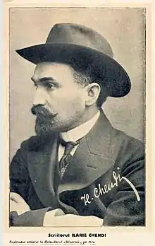 He made his prose-writing debut in 1893, and in 1898 settled in Bucharest, capital of the Romanian Old Kingdom. He published three volumes of critical columns, fragments and impressions over the course of three years (1903, 1904 and 1905), an unprecedented level of activity for a Romanian critic. Further works of impressions and literary biography followed in 1908 and 1911. For a time, he was aligned with the Sămănătorul circle of Nicolae Iorga, but broke with them in 1906. He then founded Viaţa literară, later Viaţa literară şi artistică, a magazine that appeared over the course of the year 1907 and that he wrote almost in its entirety, sometimes under pseudonyms. Although still influenced by his former colleagues' ideasZigu Ornea labeled the publication "a dissident sămănătorist magazine"he pursued a somewhat independent course, engaging in bitterly ironic polemics with Iorga. Chendi was among the founders of the Romanian Writers' Society. His intellectual ascendancy was ongoing when he committed suicide in 1913.[4]