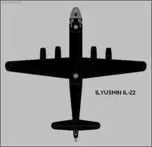 The Ilyushin Il-22, USAF/DOD designation Type 10,[1] was the first Soviet jet-engined bomber to fly. It used four Lyulka TR-1 turbojets carried on short horizontal pylons ahead and below the wing. The engines did not meet their designed thrust ratings and their fuel consumption was higher than planned. These problems meant that the aircraft could not reach its required performance and it was cancelled on 22 September 1947.[2]
