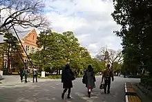 Imadegawa Street is now located between Itsutsuji Street to the north and Motoseiganji Street to the south, and is considered narrow for a major road.[1] The street passes on the north side of the Kyoto Imperial Palace and for this reason, the northern gate of the garden receives the name of Imadegawa Gomon.[1] Several universities are located along the street and for this reason its east section is considered a student district.[1]
