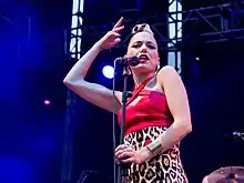 Imelda Mary Higham (née Clabby, 10 July 1974), professionally known as Imelda May, is an Irish singer, songwriter, television presenter and multi-instrumentalist. Known primarily as a singer, she also plays the bodhrán, guitar, bass guitar and tambourine. She is known for her musical style of rockabilly revival and has also been compared to female jazz musicians such as Billie Holiday.[1][2]