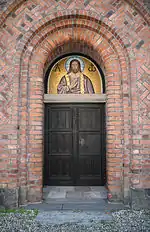 The round-arched entrance is located in the west gable. It has a tympanum with a glass mosaic. Four additional entrances, two on each side of the building, also have glass mosaics in their tympana. The eastern mosaic on the south side was designed by Niels Skovgaard, while the rest are by Joakim Skovgaard. The north and south sides also have double-height windows. There is a blinded, ornamental gallery with 11 arches supported by columns above the main entrance on the west gable, and even further up a double, round-arched opening.