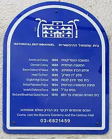 German Emperor William II, his wife Auguste Victoria, protectress of Jerusalem's Association, and their entourage stayed in Jaffa on 27 October 1898. Their travel agency Thomas Cook accommodated the imperial guests in Ustinov's "Hôtel du Parc", the only establishment in Jaffa regarded suited for them, while the further entourage stayed in Hotel Jerusalem (then Seestraße, today's Rechov Auerbach #6; רחוב אוארבך) of the Templer Ernst Hardegg.[68] Thus William II, as summus episcopus (Supreme governor of the Evangelical State Church in Prussia's older Provinces) kept the balance between Templers and Evangelical Protestants at his visit.